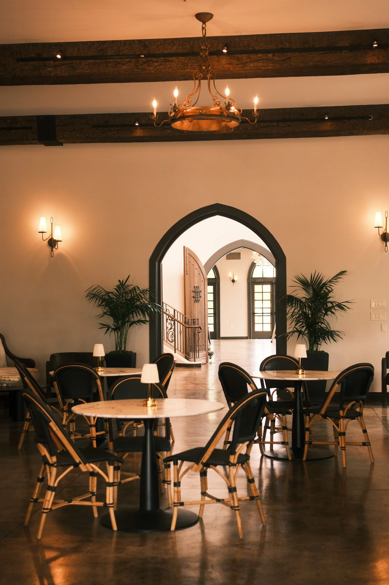 Our signature tower terraces offer sweeping wine country views, with the East Rooftop providing protected vistas of rolling hills and the West Rooftop delivering panoramic overlooks in every direction. Both spaces can be booked individually or combined for sunset events, cocktail receptions, and intimate celebrations.